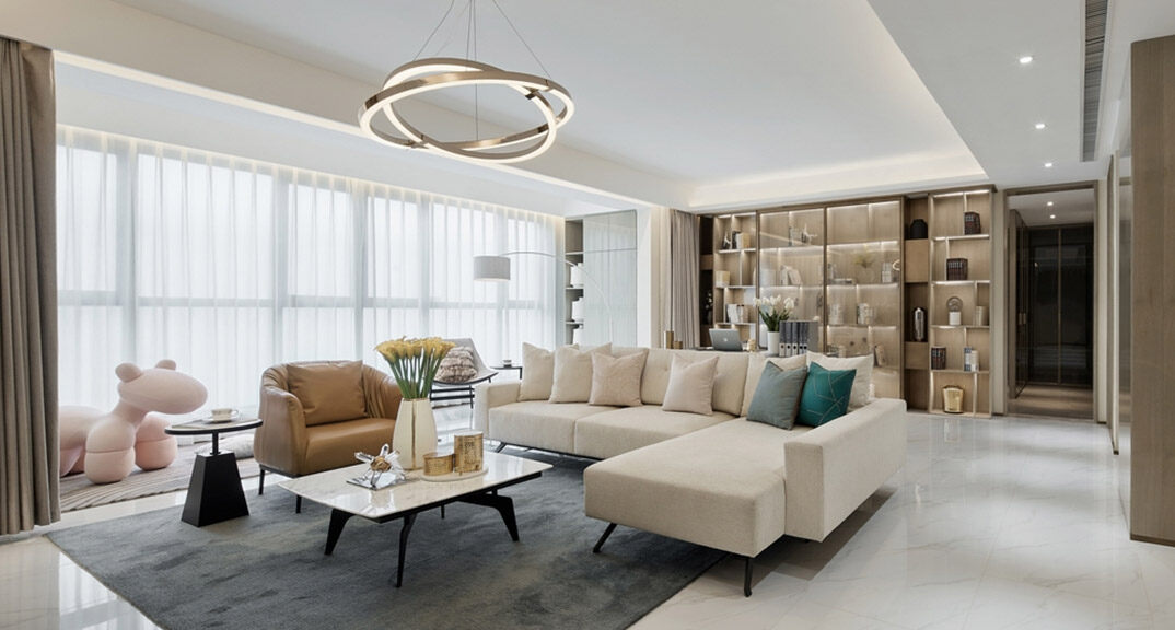 天一仁和瓏樾海125㎡別墅上疊客廳現(xiàn)代輕奢風格裝修研發(fā)效果圖