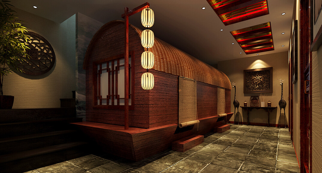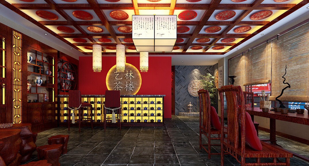 茶樓裝修200㎡茶室中式風(fēng)格案例效果圖-夏紅