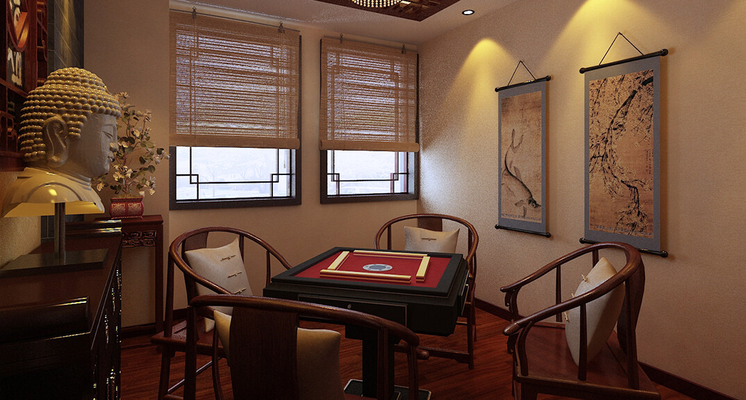 茶樓裝修200㎡茶室棋牌室中式風(fēng)格案例效果圖-冬青