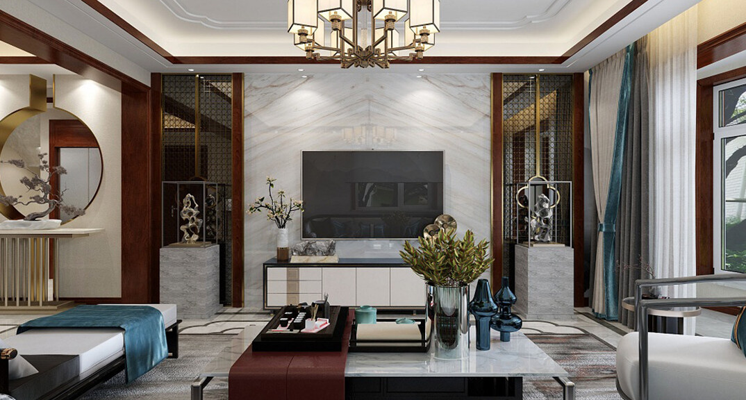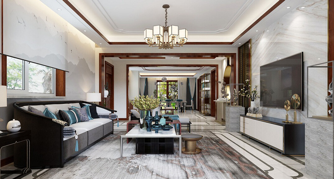 龍湖原山400㎡別墅客廳電視美式風(fēng)格裝修案例效果圖