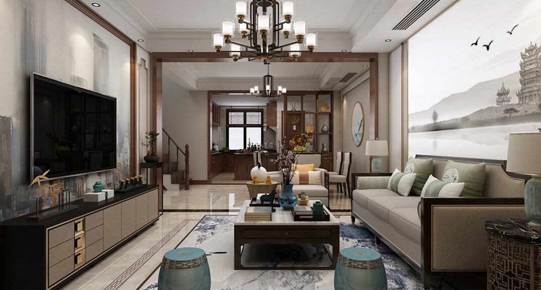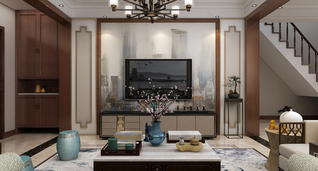 楓林小鎮(zhèn)230㎡別墅客廳電視新中式風格裝修案例效果圖