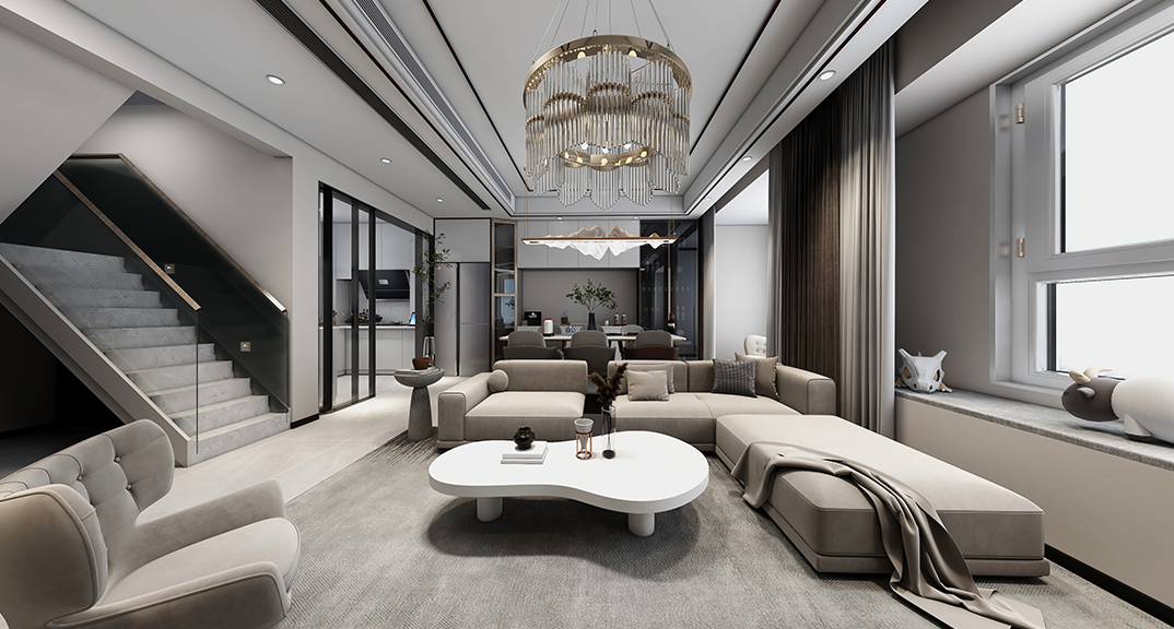 昆侖府150㎡疊拼上疊客廳現(xiàn)代輕奢風(fēng)格裝修案例效果圖