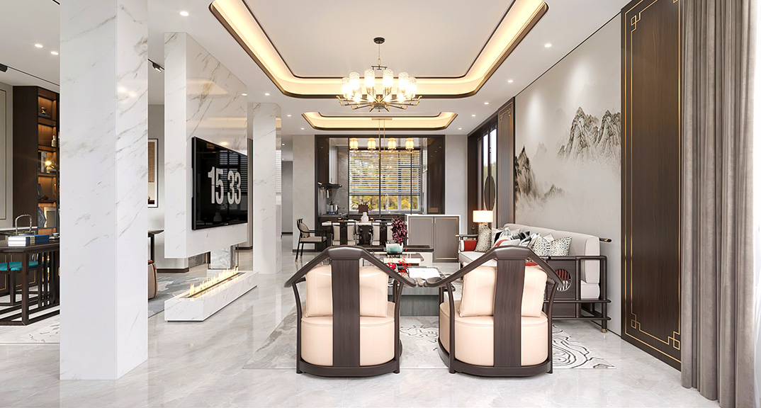 仟佰墅150㎡別墅上疊客廳新中式風格裝修案例效果圖